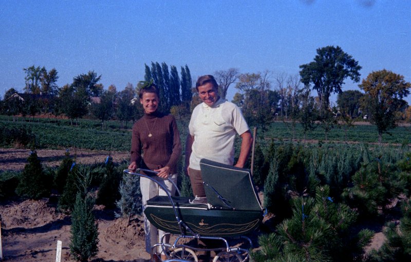 George and Claudia always visited other nurseries to see how people did things and how things grew, even with a newborn in the stroller. Circa 1972.