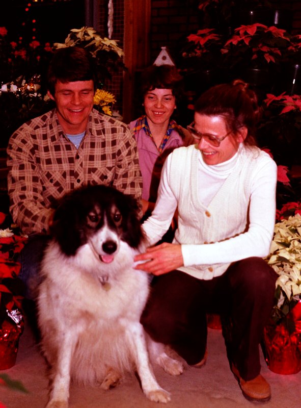 Furry friends were never excluded from the mix. Muir and his dog with Peggy and Claudia. Circa 1982