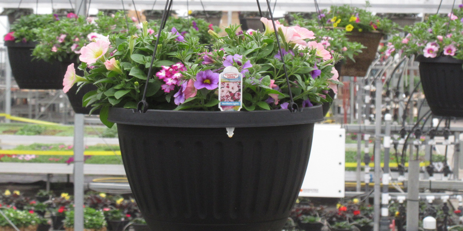 An average 13" hanging basket at the time of distribution. We try and keep our plants full, but compact for distribution. If the plants are too large, they tend to break as people bring them home.