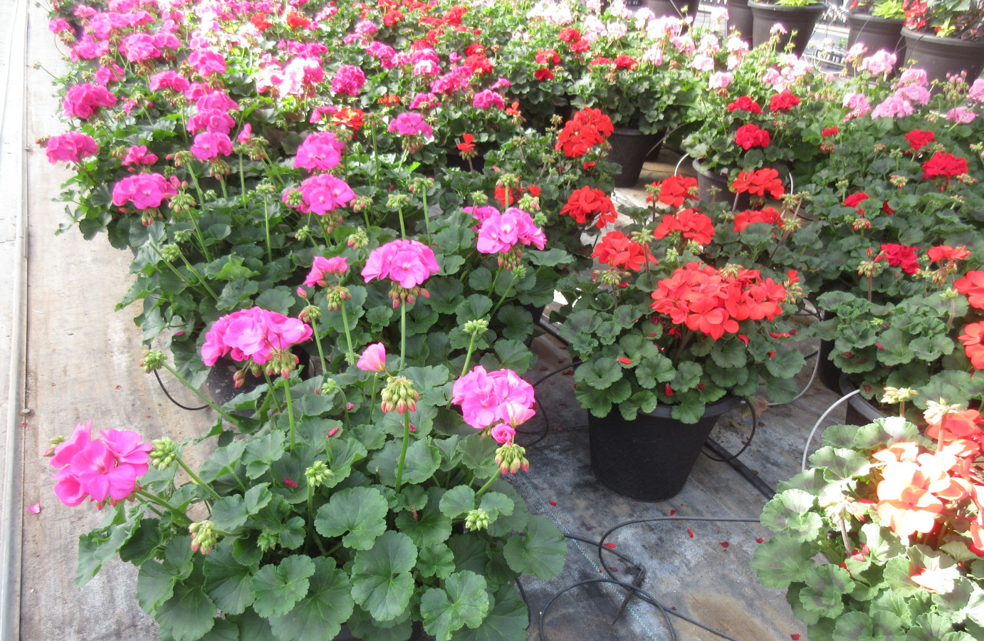 Smaller 10" pots are often single-species pots, like these geraniums. Smaller pots don't contain enough soil volume or space to make mixes that last all season, while single-species like these do.