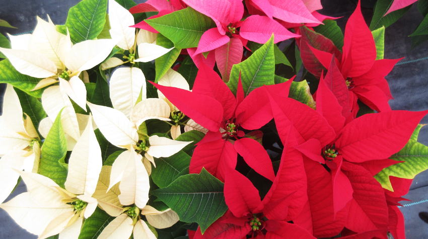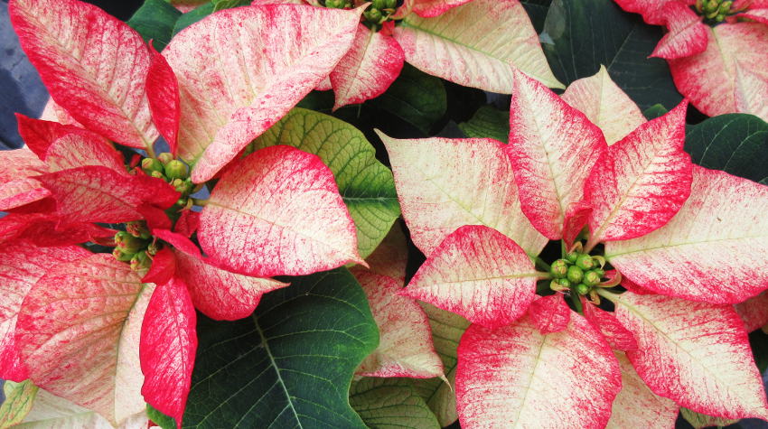 Poinsettias aren't just red. White is the second most popular colour. We grow a number of tri-colour poinsettias in 10" pots.